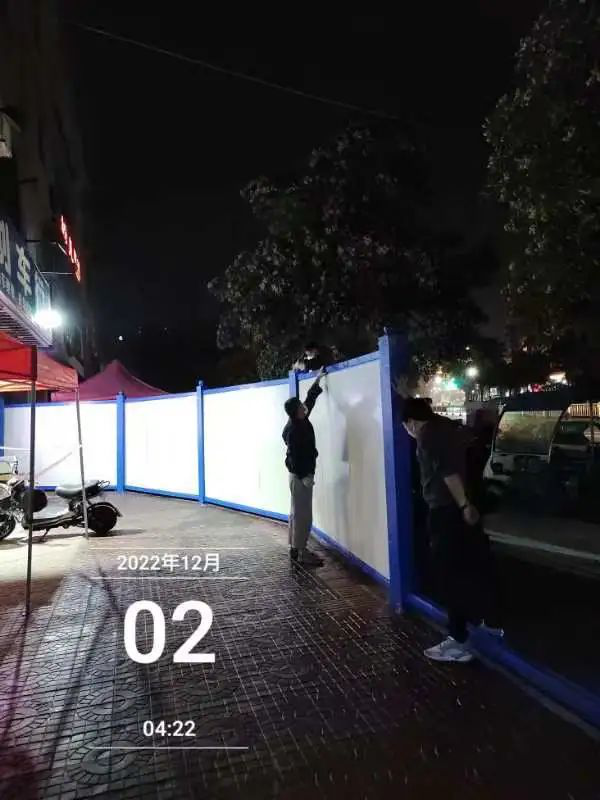 接到電話后,集團管理層第一時間反應,全公司立即啟動一級應急響應模式。利用電話、微信等平臺統籌工作部署,聯系工廠負責人,到宿舍一間一間敲門叫醒正在熟睡的工人。集團總工、供應部總監、行政負責人等全體出動,帶著10多位工人和提前協調從多處調來用作準備的500米擋板物資,頂著狂風暴雨迅速趕赴指定現場,開展防疫封控工作,爭分奪秒地筑起一道道隔開病毒與民眾的“安全墻”,積極配合區政法委緊急處理疫情封控工作。