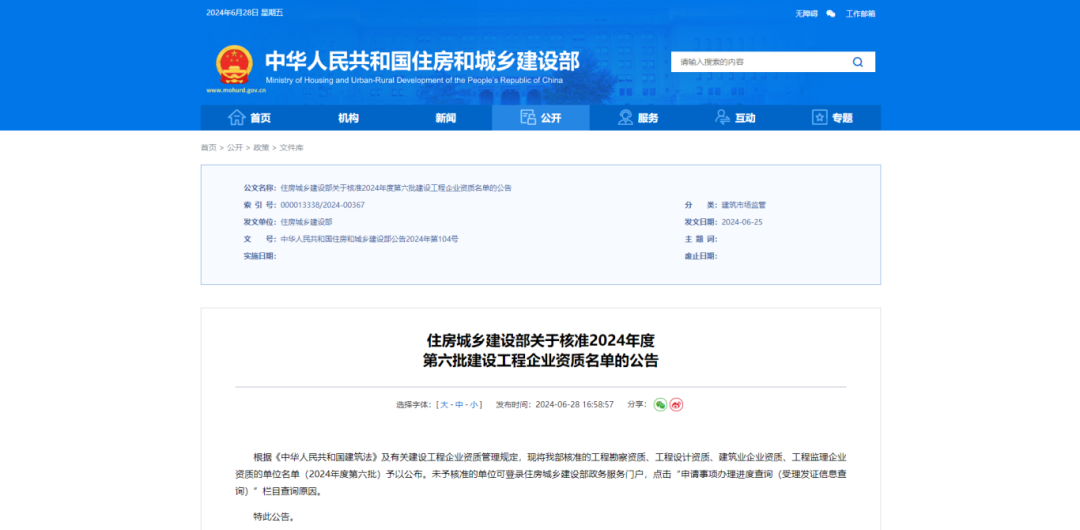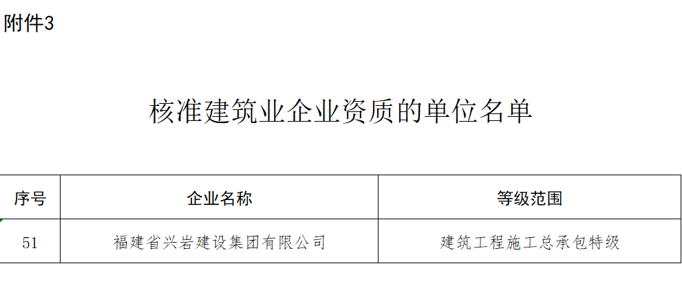 近日,中華人民共和國住房和城鄉建設部公布了《住房城鄉建設部關于核準2024年度第六批建設工程企業資質名單的公告》(中華人民共和國住房和城鄉建設部公告2024年第104號)文件,福建省興巖建設集團有限公司獲批建筑工程施工總承包特級資質!